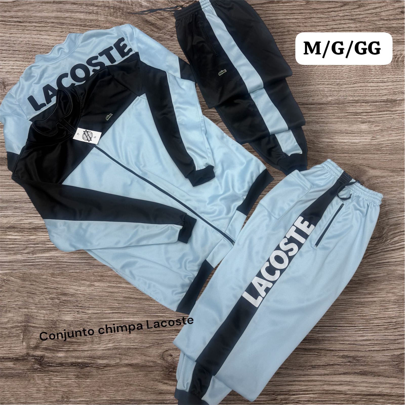 - Estilo moderno: Combinación de colores con logos Lacoste destacados en campera y pantalón.